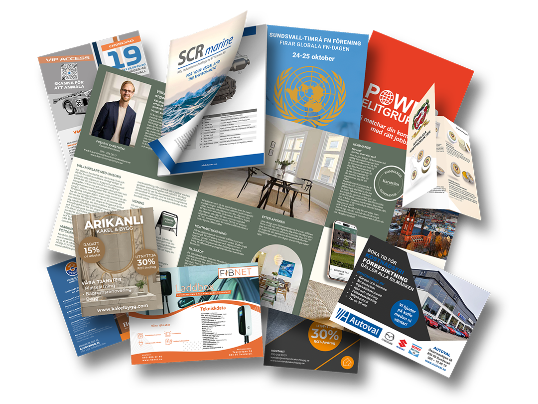 Vi utformar layout och grafiskt material för både digitalt och tryckt användning – allt från broschyrer och kataloger till presentationer och annonser. Genom att kombinera typografi, färg och bildspråk skapar vi tydliga och visuellt tilltalande lösningar som förstärker budskapet och ger ett professionellt uttryck.